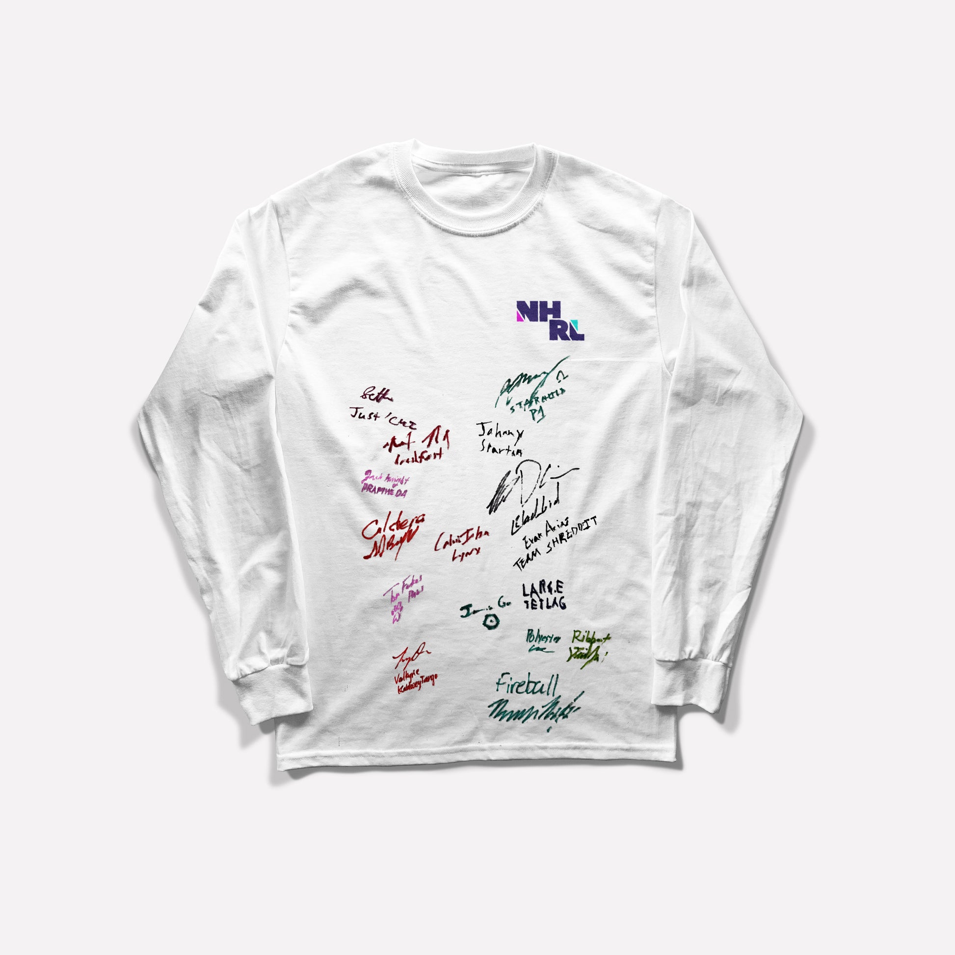 This basic white long sleeve is perfect for repping the league in ultimate comfort! Featuring NHRL's logo printed on a soft white long sleeve tee, plus hand written signatures from your favorite builders, this shirt will keep you cozy and stylish. This shirt is signed by the following builders: