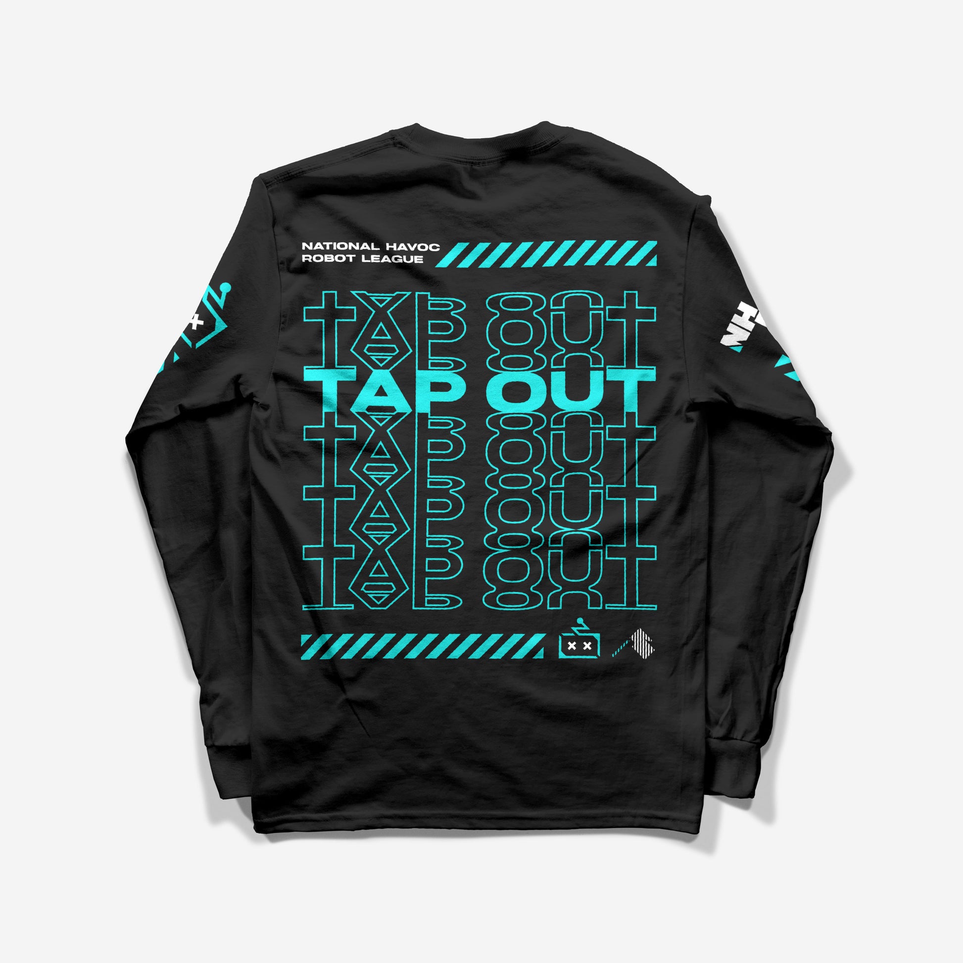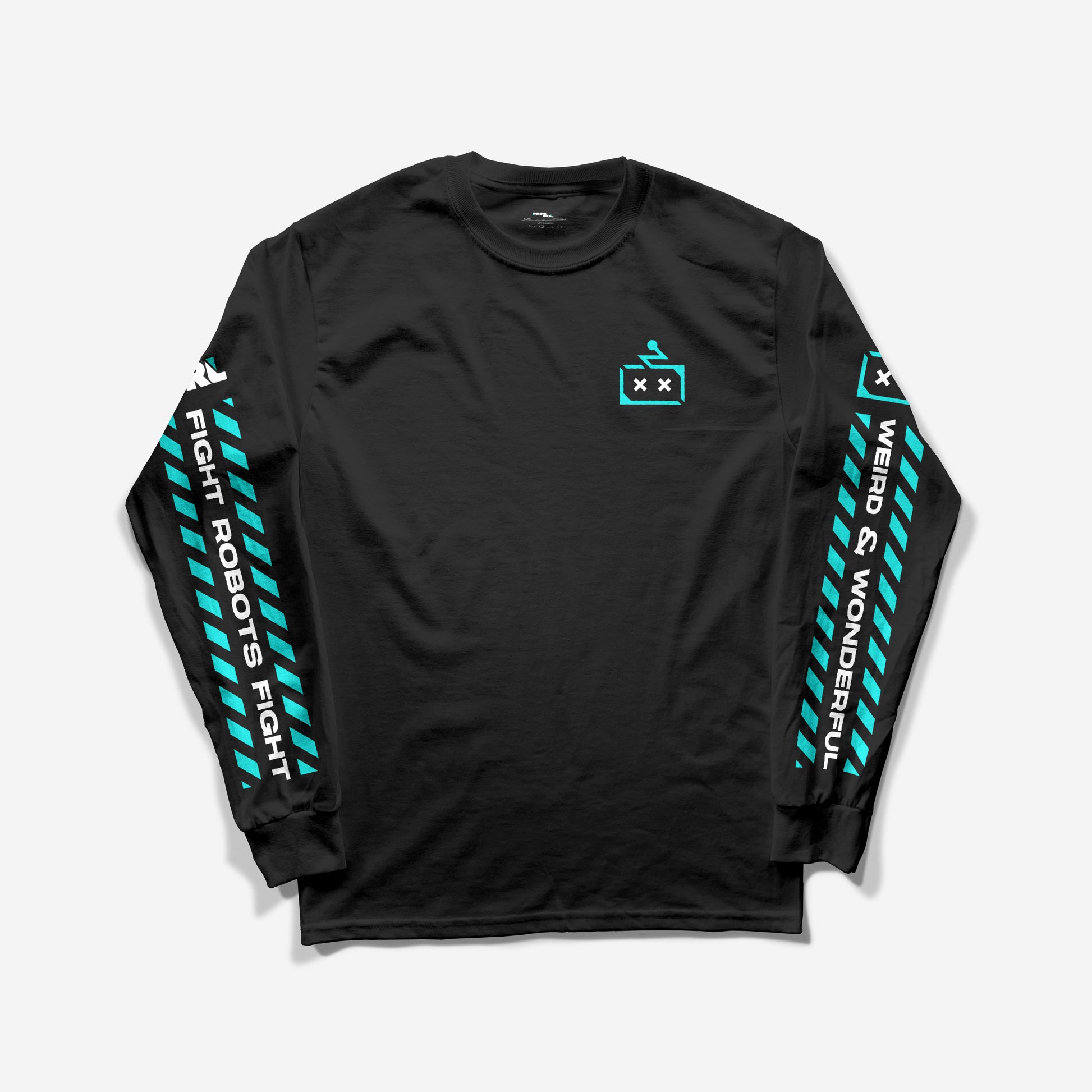 Fight Robots, Fight! This cozy long sleeve shirt features designs on the back and sleeves, as well as a little sparky icon on the front. With a super cool turquoise and white on black color palette, this weird and wonderful shirt is bound to turn heads.